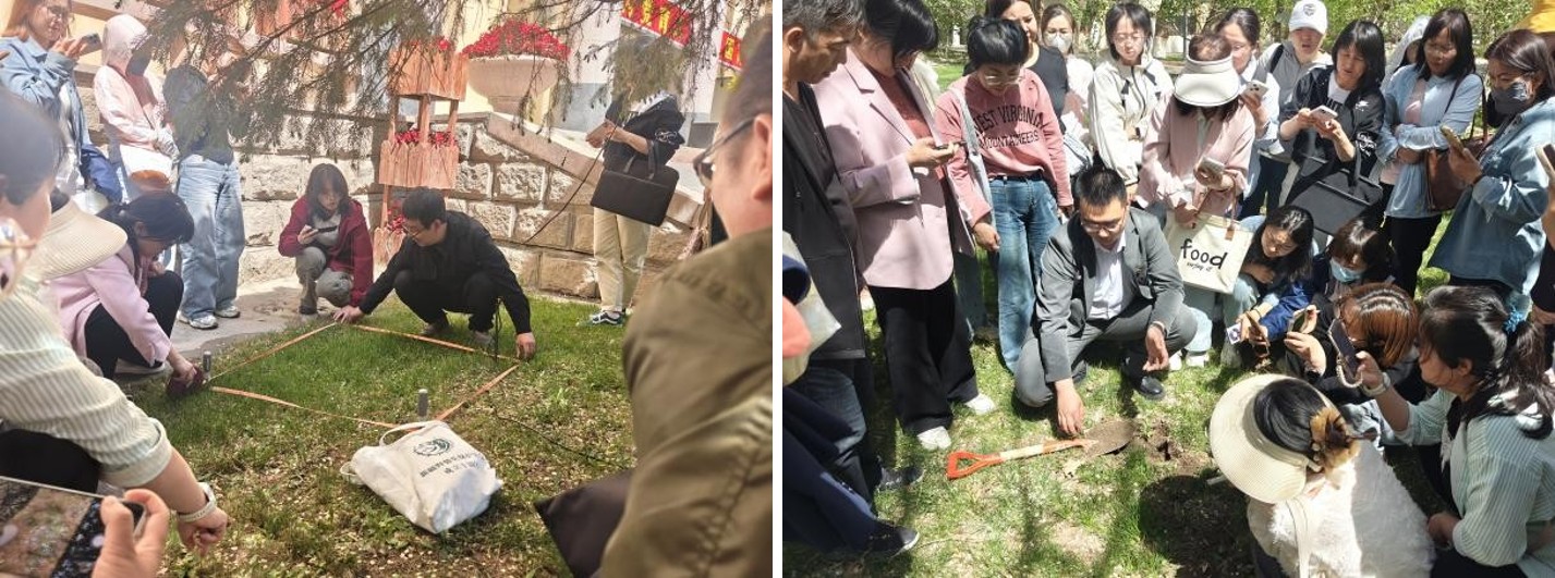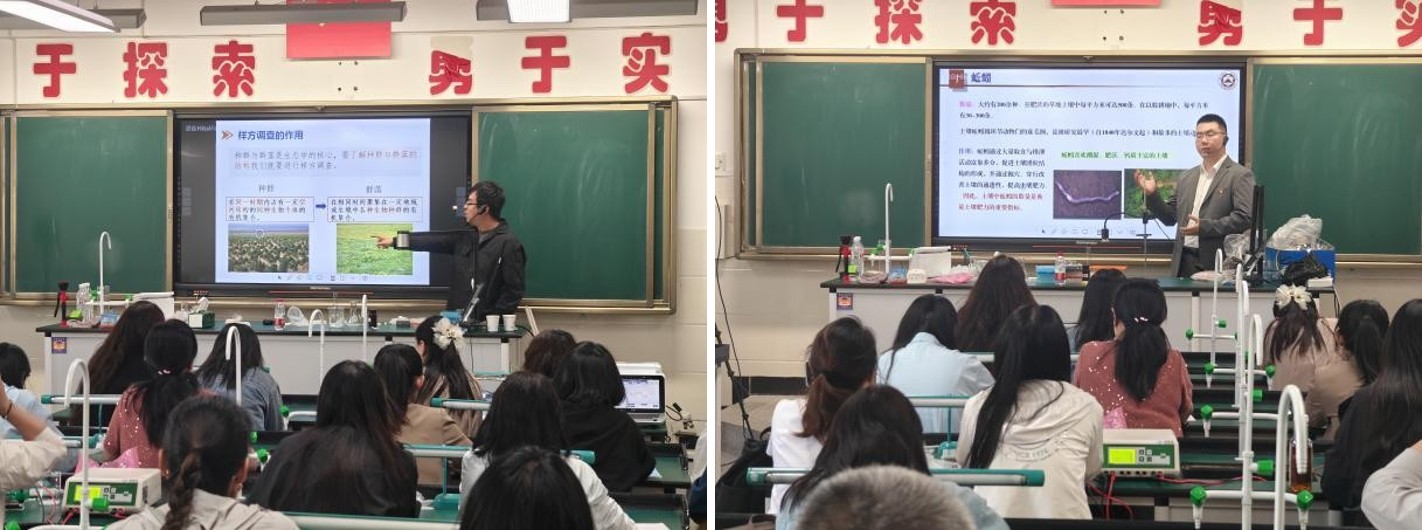 在户外实践教学培训环节,周小龙与邢文黎带领教师们来到户外场地,围绕校园区域进行实地考察。周小龙现场示范、悉心指导样方调查时的注意事项,邢文黎演示土壤剖面挖掘与土壤样品的采集方法,并结合实际场景以土壤线虫为例讲解土壤学研究方法与实践要点。这种理论与实践相结合的教学方式,让教师们深刻认识到实践教学在生物学科中的重要性,也为他们日后开展相关教学活动提供了宝贵的实践经验与创新思路。