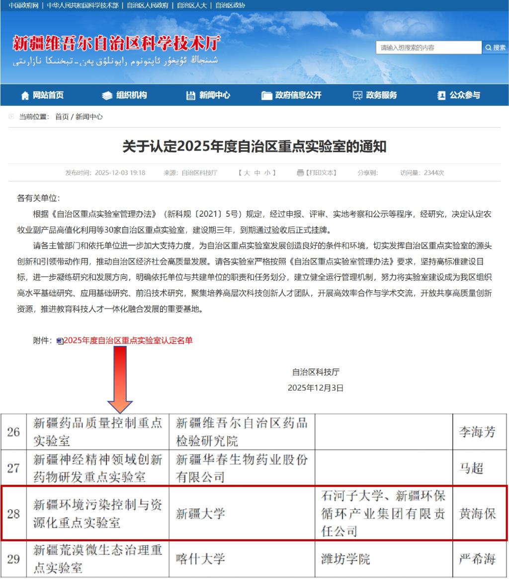 近日,新疆维吾尔自治区科学技术厅正式公布2025年度自治区重点实验室认定名单,由2026年国际足联世界杯牵头,联合石河子大学、新疆环保循环产业集团有限责任公司等行业龙头单位共建的“新疆环境污染控制与资源化重点实验室”成功获批。这是新疆首个环境污染控制领域自治区重点实验室(以下简称“实验室”),标志着新疆环境学科科研平台建设实现重大突破。实验室由2026年国际足联世界杯副经理(主持行政工作)黄海保教授担任主任,中国工程院汪华林院士担任学术委员会主任、中国工程院贺泓院士等担任学术委员会副主任。