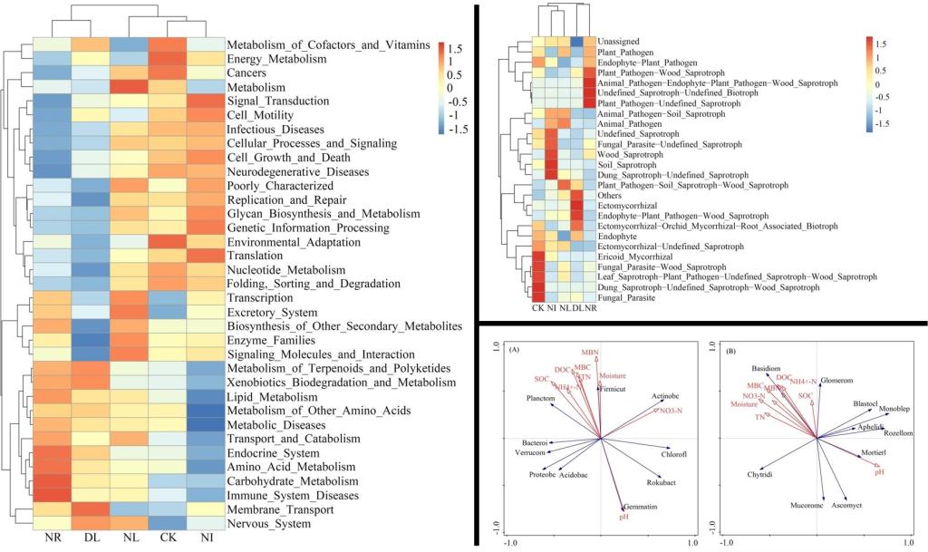 图2 左:不同处理下土壤细菌功能群的变化;右上:不同处理下土壤真菌功能群的变化;右下:土壤细菌(A)与真菌(B)群落和土壤理化性质间的冗余分析。注:CK,DL,NL,NR和NI分别代表对照组、双倍凋落物组、凋落物去除组、切根组、凋落物去除合并切根组。