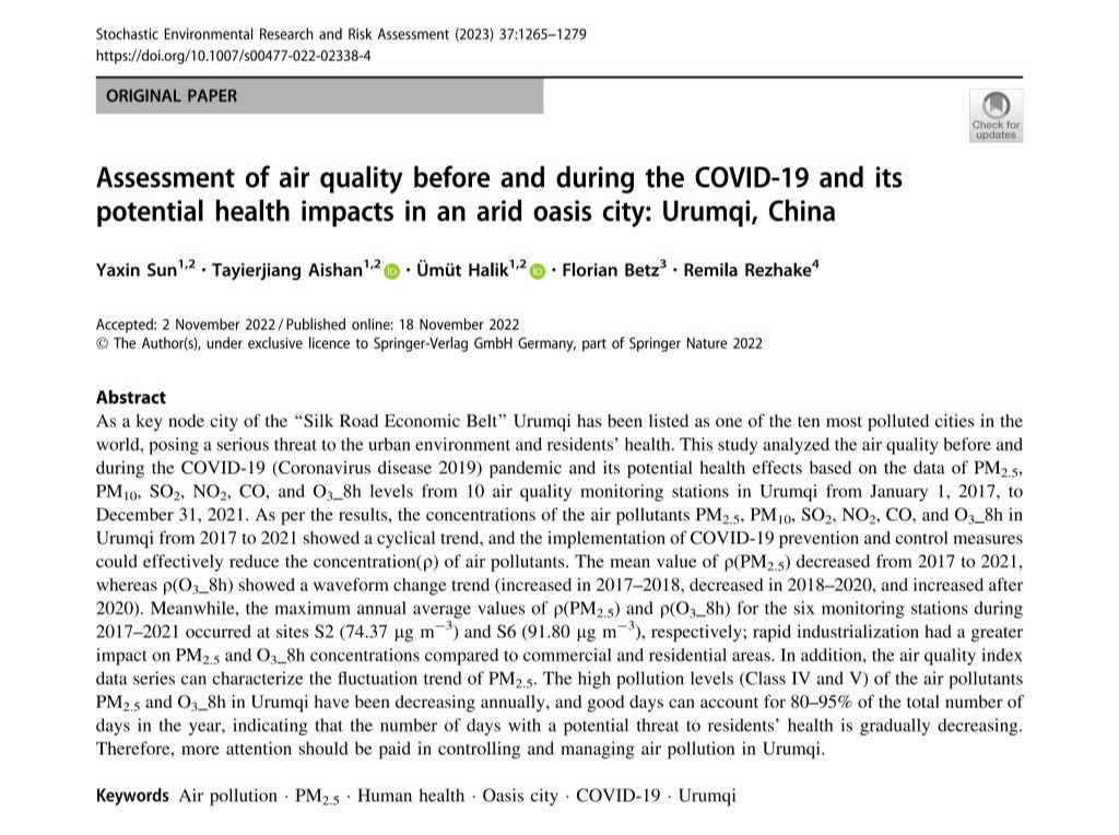 20221118日,公司塔依尔江·艾山副教授课题组在统计与概率学1区期刊Stochastic Environmental Research And Risk Assessment上发表题为“Assessment of air quality before and during the COVID-19 and its potential health impacts in an arid oasis city: Urumqi, China”的研究论文,该论文第一作者为硕士研究生孙雅欣。