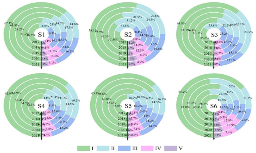 2  乌鲁木齐市6个监测点的PM2.5污染水平的天数百分比
