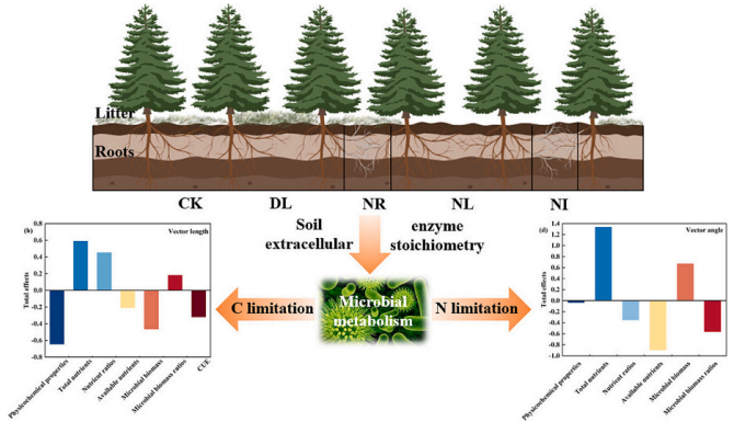 土壤胞外酶化学计量能够反映土壤微生物群落的养分需求和利用能力,通过控制根系和植物残体的输入DIRT探究其如何影响土壤微生物营养限制状况,对评估高山森林生态系统中土壤养分的可用性和微生物养分限制具有重要意义。