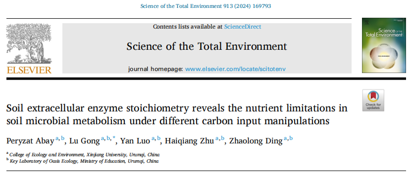 202413日,公司贡璐教授课题组在环境科学与生态学1区期刊Science of The Total Environment上发表题为“Soil extracellular enzyme stoichiometry reveals the nutrient limitations in soil microbial metabolism under different carbon input manipulations”的研究论文,分析了外源性有机质输入下土壤微生物的养分限制特征,论文第一作者为博士研究生拍丽扎提·阿白。