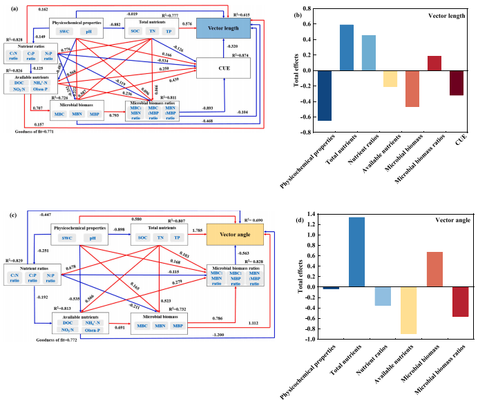 2  采用偏最小二乘路径模型(PLS-PM)分析影响微生物C-(a)和N-(c)代谢限制的可能途径