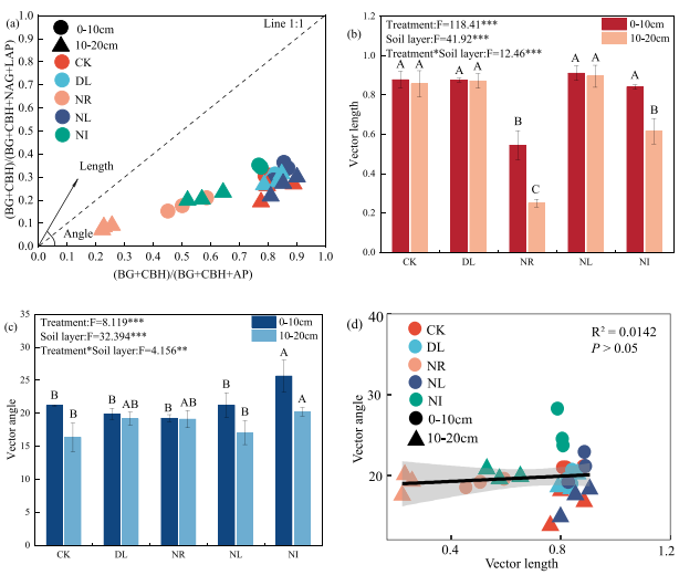 1  碳氮获取酶与碳磷获取酶相对比例的生态酶化学计量(a)、矢量长度(b)和角度(c)的变化特征与关系(d)