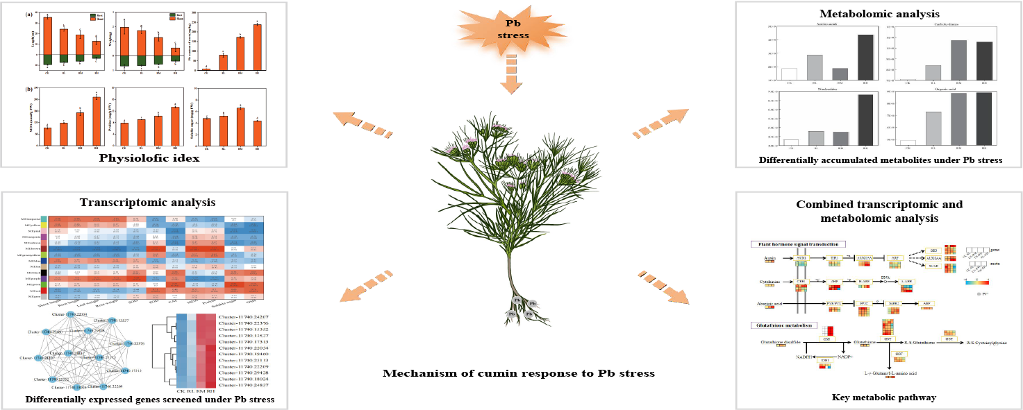 该研究结合生理学、转录组学和代谢组学探究孜然响应铅胁迫的分子机制。结果表明,铅胁迫改变孜然的生理生化指标,抑制了孜然的生长。同时,孜然通过改变根部金属离子转运基因的表达,影响铅的积累和转运。代谢组学分析表明,在铅胁迫下,与氨基酸、有机酸和碳水化合物相关的代谢途径得到了增强。转录组测序筛选出的差异表达基因(DEGs)主要涉及氧化还原酶活性、跨膜运输、植物激素信号转导和MAPK信号转导途径。综合分析表明,谷胱甘肽代谢和植物激素信号转导是孜然抵抗铅胁迫的重要途径。