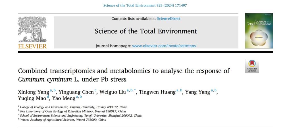 202436日,公司刘卫国教授课题组在环境科学与生态学1区期刊Science of The Total Environment上发表题为“Combined transcriptomics and metabolomics to analyse the response of Cuminum cyminum L. under Pb stress”的研究论文,分析了孜然抵抗铅胁迫的分子机制,论文第一作者为硕士研究生杨新龙。