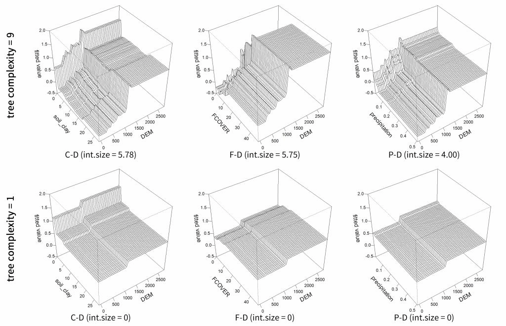 图3 三个最强成对交互作用的三维部分依赖图(上)与无成对交互作用模型的三维部分依赖图(下)的比较