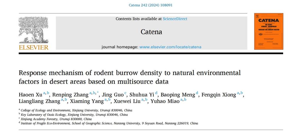 2024年5月4日,公司张仁平教授课题组在农林科学1区期刊Catena上发表题为“Response mechanism of rodent burrow density to natural environmental factors in desert areas based on multisource data”的研究论文,分析了植物群落类型及植物物种对于鼠洞密度的影响,论文第一作者为本科生徐浩恩。