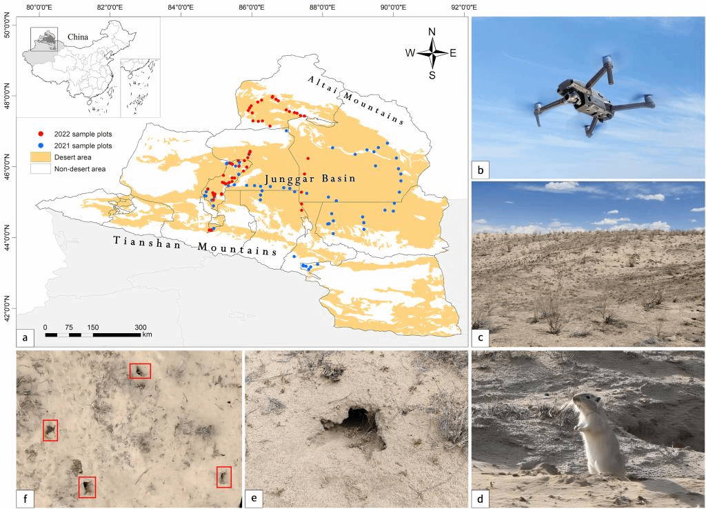 该研究利用无人机航拍监测荒漠鼠洞密度信息,在大区域尺度上分析了植物群落类型及植物物种对于鼠洞密度的影响,并通过模型构建探索了其他影响鼠洞密度的自然环境因子。研究可为及时准确地掌握鼠洞空间分布特征,减缓荒漠生态系统退化趋势以及保障其健康可持续发展提供理论依据。