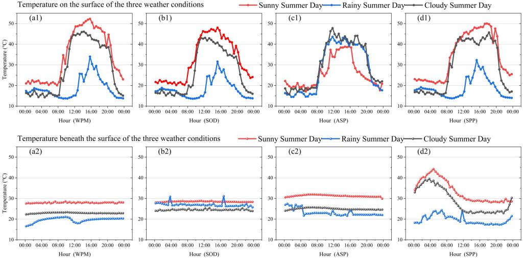 图3  三种典型天气条件下四种材料的面上、面下温度变化