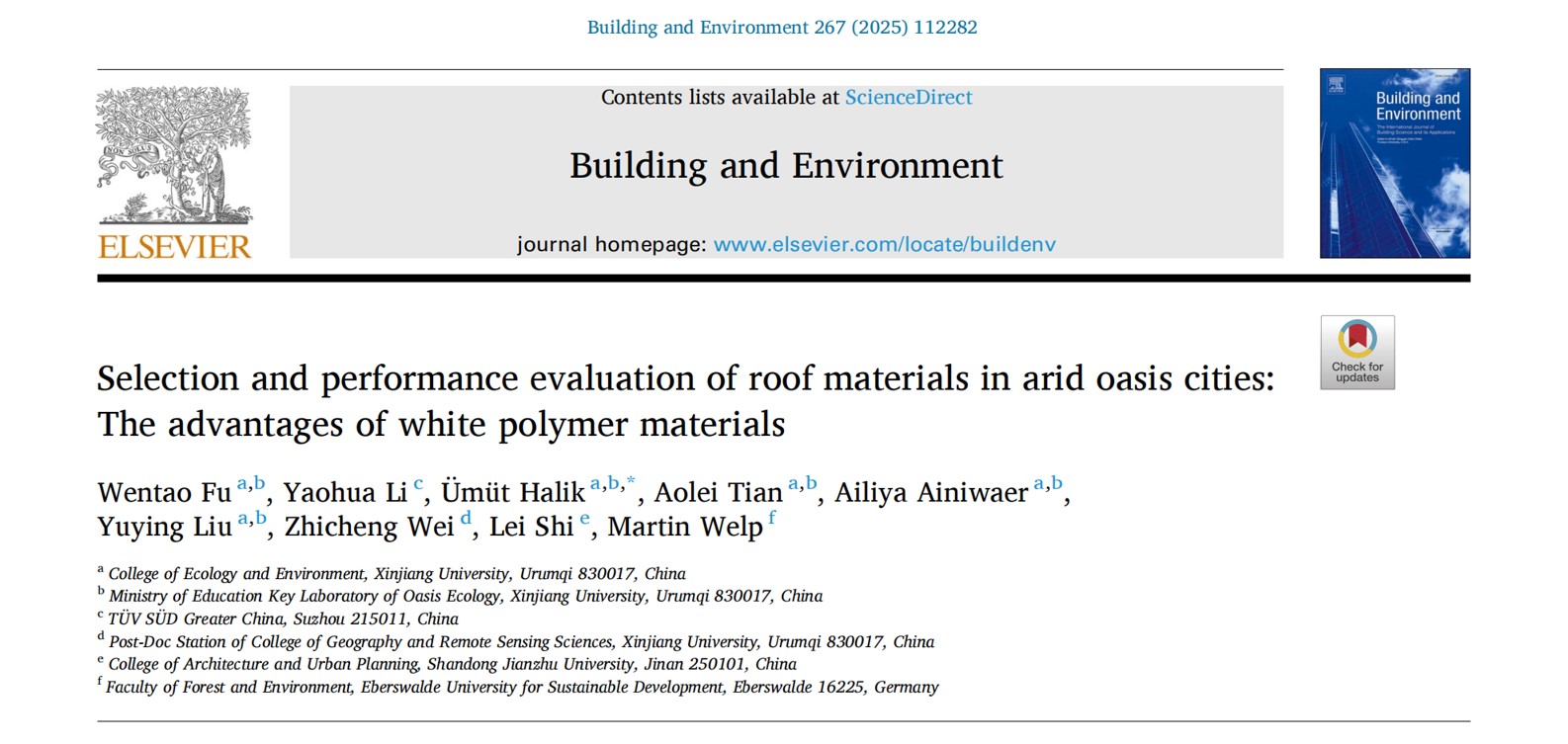 2024115日,公司玉米提·哈力克教授课题组在工程技术1区期刊Building and Environment上发表题为“Selection and performance evaluation of roof materials in arid oasis cities: The advantages of white polymer materials”的研究论文,报道了一种能有效降低屋顶面下温度的高分子材料,论文第一作者为博士研究生符文涛。