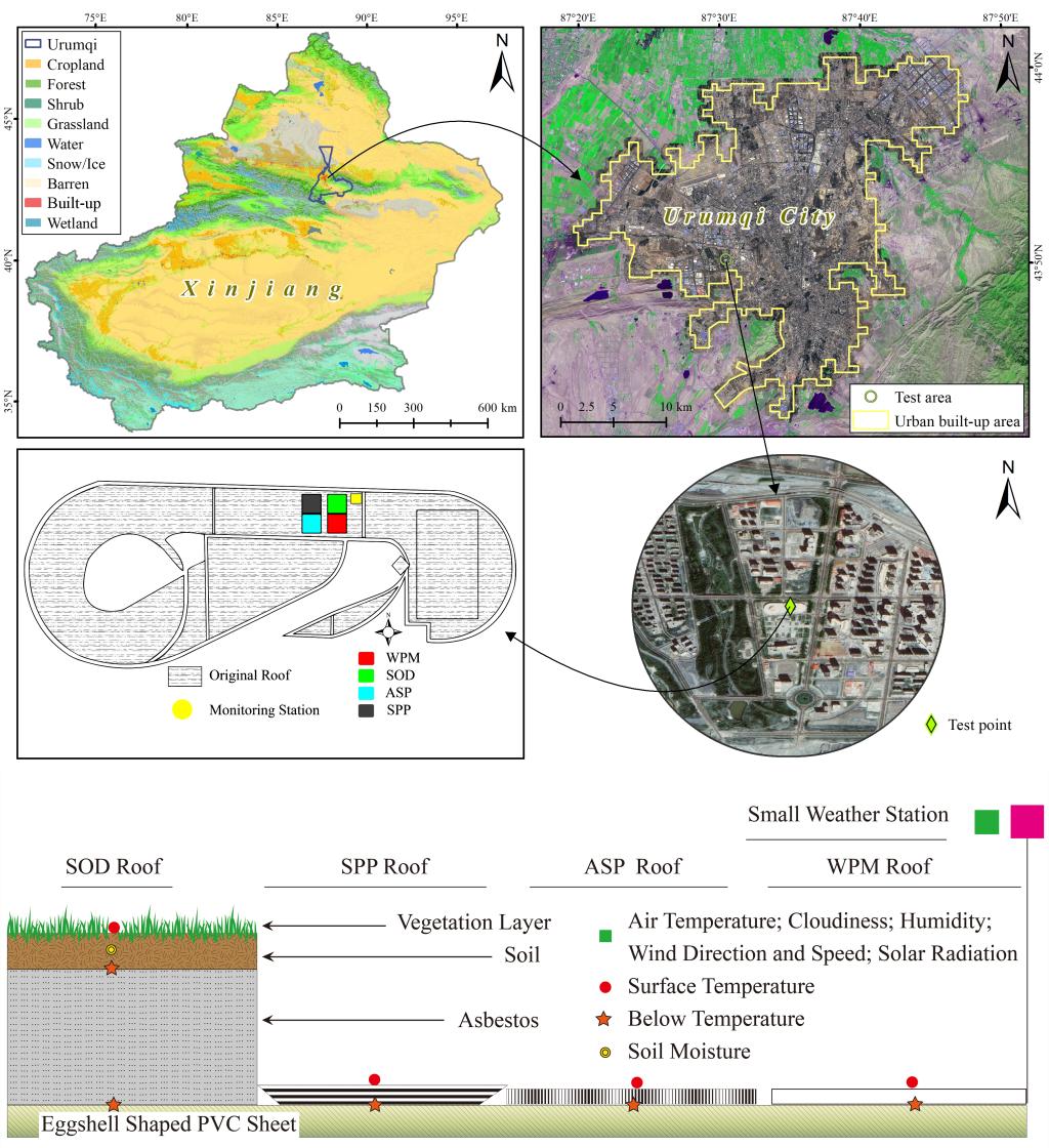 城市化进程的加快以及商业活动的日益集中导致城市热岛效应尤为严重。利用反射屋顶技术,如高分子材料屋顶,可以有效地减轻热浪引起的多余热量,提高舒适度。然而不同天气条件对屋顶材料降温效果的影响目前知之甚少,尤其是在中国西北部乌鲁木齐市这样的干旱区绿洲城市,探究屋面材料的降温性能具有重要的生态意义。