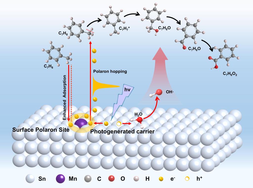 该研究制备了原子分散Mn位点修饰的低结晶度SnO2(Mn1/SnO2),通过XAS、Raman、fs-TAS等表征表面极化子的形成机制,结合DFT和原位DRIFTS探究其对电荷动力学和甲苯氧化热力学的影响。研究发现极化子通过电子-声子耦合诱导晶格畸变,实现皮秒级电子捕获,建立~65 ps的界面电荷转移通道,抑制载流子复合。极化子场增强甲苯吸附能(从-0.49 eV至-0.91 eV),极化C-H键并降低活化能垒(决速步能垒从3.37 eV降至2.93 eV)。Mn1/SnO2在60000 mL·gcat-1·h-1高空速下实现甲苯近100%氧化,600分钟稳定运行,5%-90%湿度下保持70%以上效率。