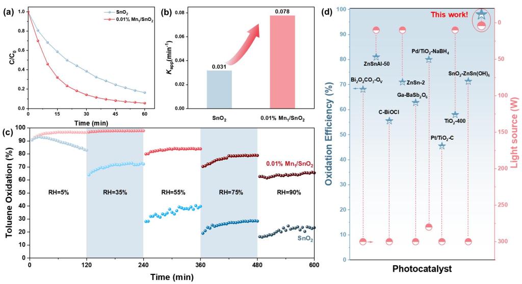 图2 (a) 静态反应条件下甲苯的光催化氧化及(b) SnO2和0.01% Mn1/SnO2在光照下的表观速率常数。(c) SnO2和0.01% Mn1/SnO2在流通系统中甲苯光催化氧化的长期稳定性及不同湿度测试。(d) 已报道的先进催化材料对甲苯的氧化效率及光源对比。
