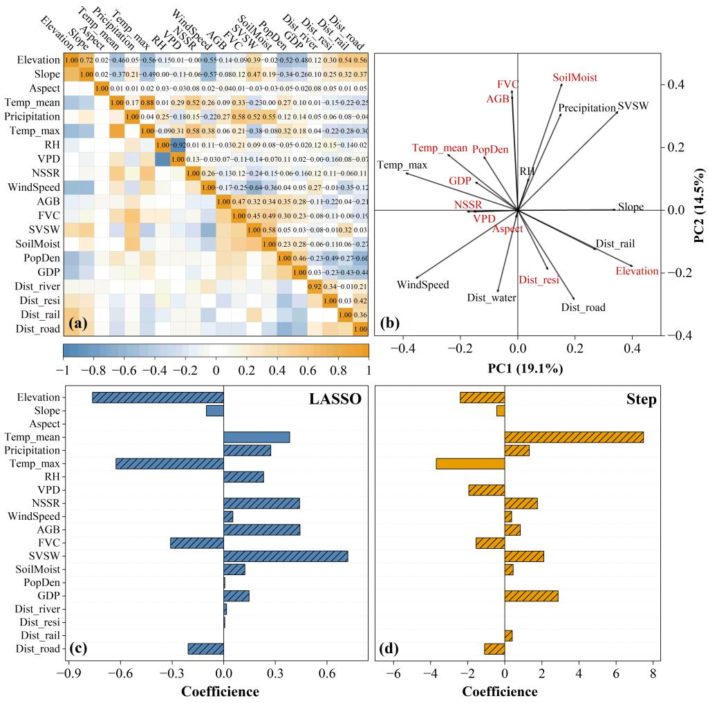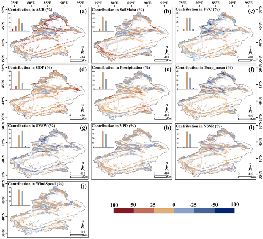 研究对比分析了多种变量筛选方法和多种机器学习模型,使用最优模型模拟 了2001-2022年新疆森林草原火灾风险的时空动态,并进一步揭示了火灾风险变化的驱动机制。研究结果表明,新疆森林草原火灾风险呈现西北高,东南低的空间分布格局,北部高风险地区火灾风险呈下降趋势,而南部低风险地区的火灾风险表现出前期风险升高而后期风险降低的趋势转变。以上特征是由气候、人类活动等多个因素共同影响的,其中地上生物量(AGB)在准噶尔盆地与塔里木盆地周边表现出强烈的正向影响,气温、降水、土壤湿度等环境因子则在对新疆南部干旱区草地生态系统中表现出显著影响。