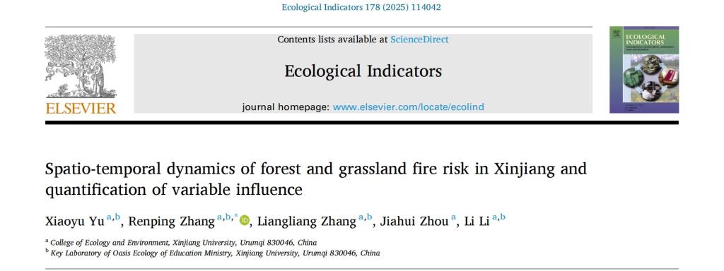 2025年8月15日,公司张仁平教授课题组在环境科学与生态学1区期刊Ecological Indicators上发表题为“Spatio-temporal dynamics of forest and grassland fire risk in Xinjiang and quantification of variable influence”的研究论文,揭示了2001-2022年新疆森林草原火灾风险的时空演变特征,论文第一作者为硕士研究生余晓宇。