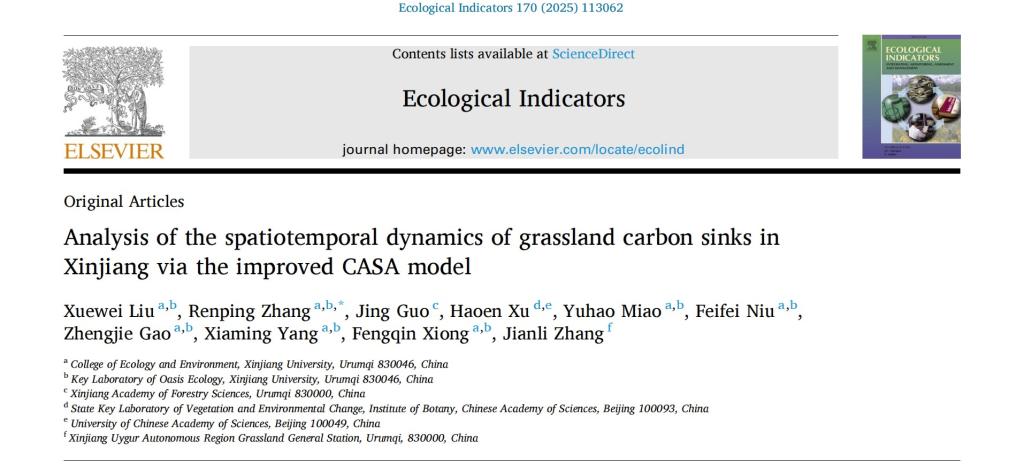 202514日,公司张仁平教授课题组在环境科学与生态学1区期刊Ecological Indicators上发表题为Analysis of the spatiotemporal dynamics of grassland carbon sinks in Xinjiang via the improved CASA model的研究论文,评估了旱区草地净初级生产力和净生态系统生产力,论文第一作者为士研究生刘雪薇