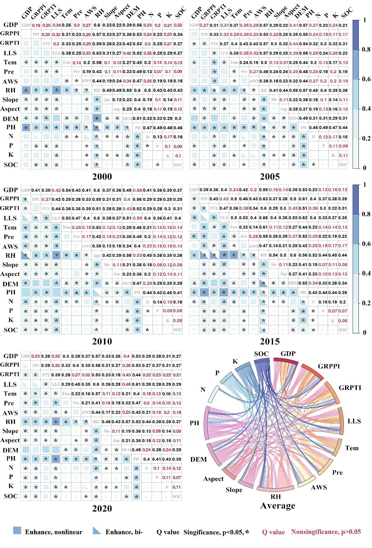 图3  成对因子和NEP之间的相互作用和生态检测器的q统计(GDP:国内生产总值、GRPPI:第一产业、GRPTI:第三产业、LLS:牲畜放牧、Tem:温度、Pre:降水、AWS:平均风速、RH:相对湿度、Slope:坡度、Aspect:坡向、DEM:高程、PH:土壤PH、N:土壤N、P:土壤P、K:土壤K、SOC:土壤有机碳含量)