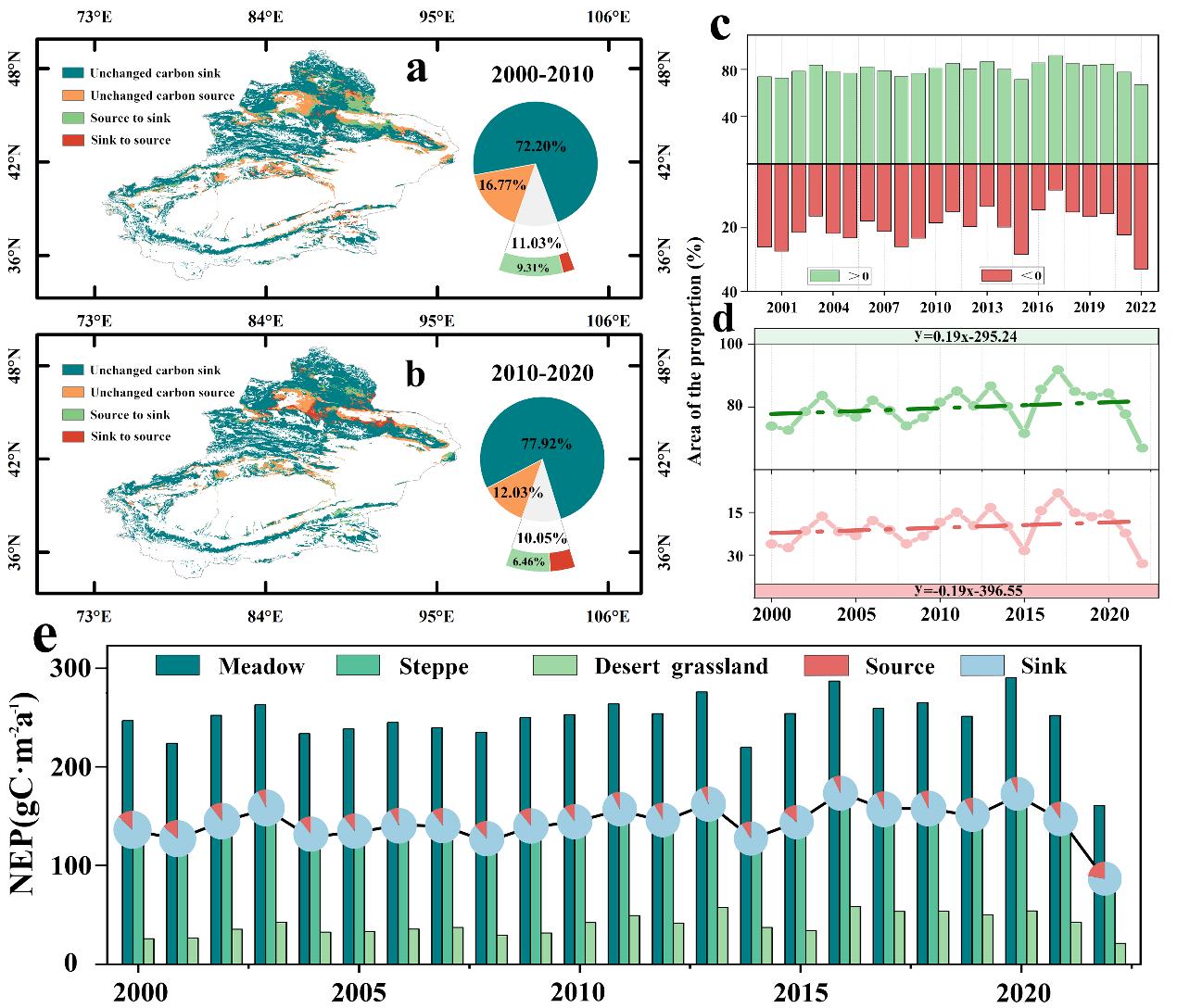 图2  (a-b)2000-2020年新疆草地源汇转换格局;(c-d)2000-2022年新疆草地碳源、碳汇面积占比及变化趋势;(e)新疆3种草地NEP年际变化