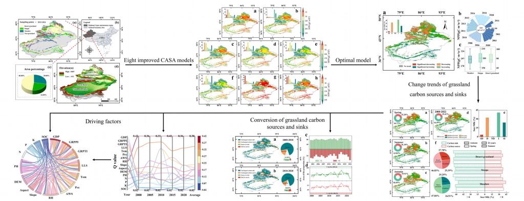 该研究通过改进CASA模型关键参数计算方法,重构了8CASA模型并筛选出最优模型从而提升草地NPP估算精度。此外,通过地理探测器模型探索了多源驱动因子交互作用对草地NEP的影响。研究可为准确评估旱区草地碳汇及源汇转化提供科学依据 ,对制定草地管理政策以应对草地碳汇变化提供理论指导。