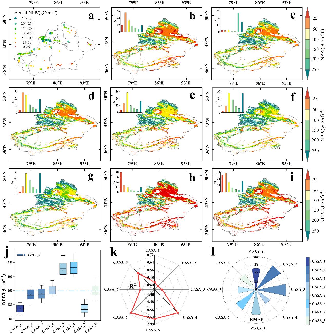 图1  (a)7-8月实际NPP值;(b-h)CASA_1-CASA_8模型2000-2022年草地NPP空间分布特征及面积占比;(j)8种CASA模型2000-2022年草地NPP的分布范围;(k)8种CASA模型在草地生态系统中的相关系数平方(R2);(l)8种CASA模型在草地生态系统中的均方根误差(RMSE)